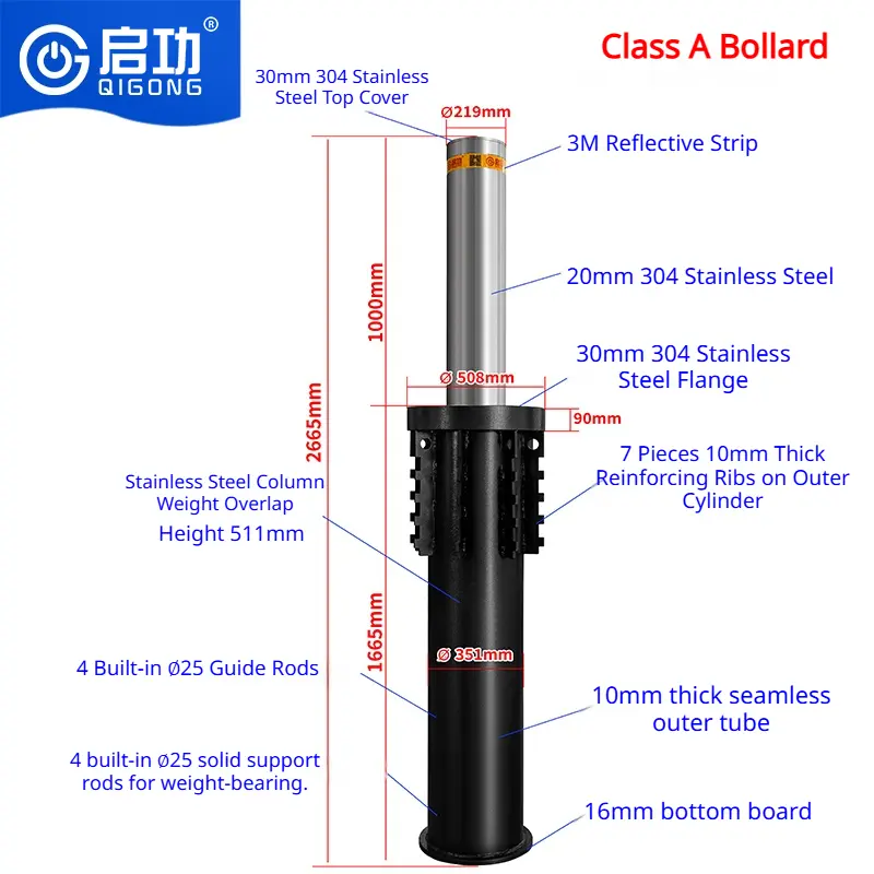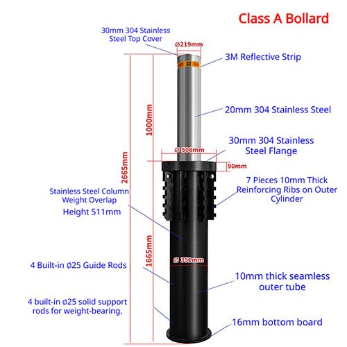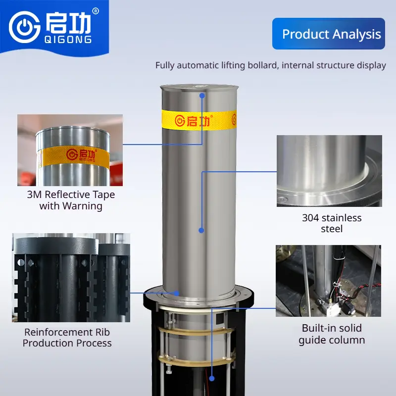 Our fully automatic rising bollard is engineered with a robust internal structure, using high-quality 304 stainless steel for durability and corrosion resistance. The reinforced rib design enhances impact strength, while the built-in solid guide column ensures stable and smooth operation. Equipped with 3M reflective warning tape, it provides excellent visibility and safety in all environments, making it ideal for high-security access control applications.