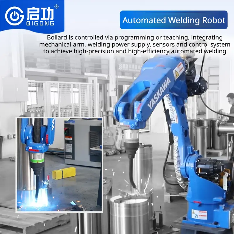 Automated welding robots are used to ensure precise and consistent assembly of each bollard. By integrating robotic arms, welding systems, and intelligent controls, the process delivers clean welds, strong structural connections, and stable quality, while also improving overall production efficiency.