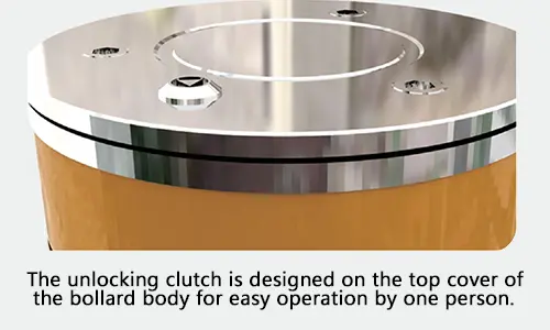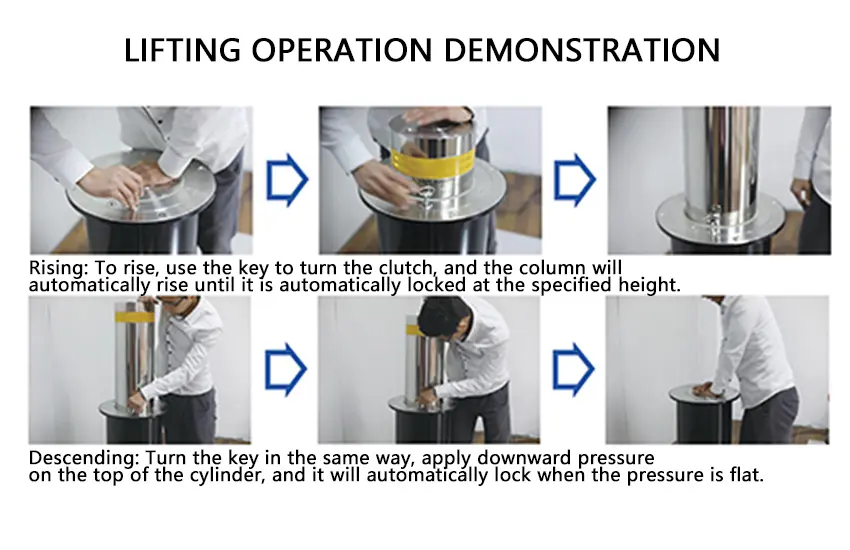 The descent process of the Semi-Automatic Bollard is mainly achieved by the operator’s own weight pressing down. When the top of the column reaches a position flush with the ground, the machine self-locks to maintain it. The rising process of the column is 100% realized by the internal air pressure device of the semi-automatic pile guard. After using a special key to release the mechanical lock, the column automatically rises to its original position and is self-locked without exerting any external force. The pneumatic booster device is available in a variety of specifications according to column specifications and customer requirements.