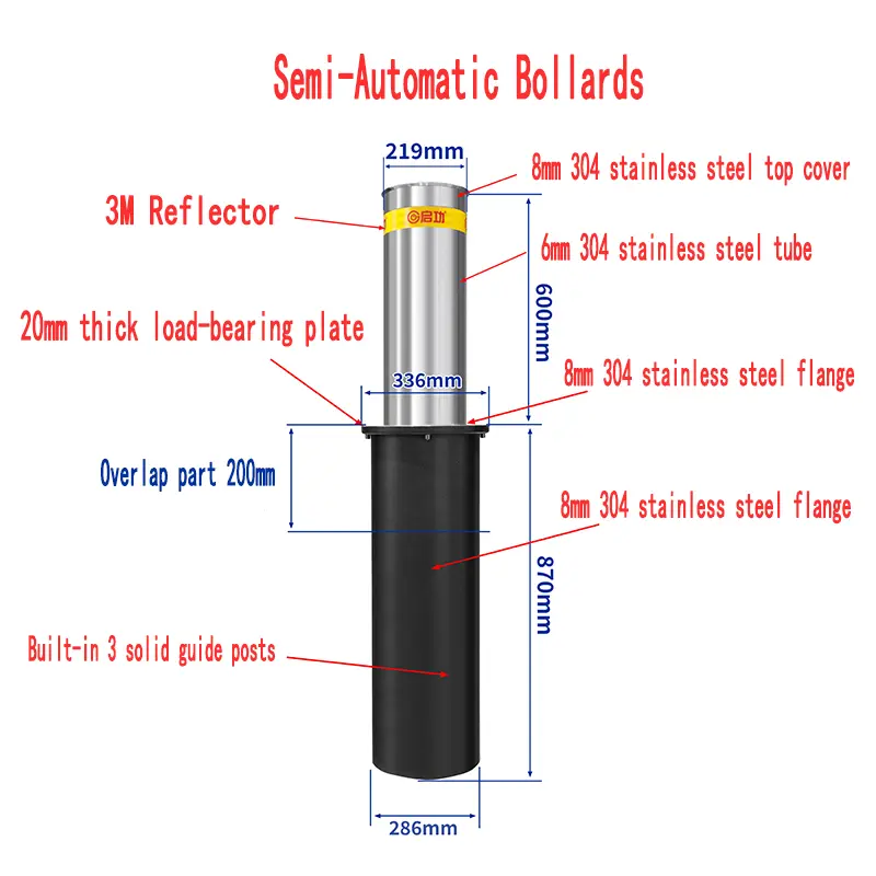 Semi-Automatic Bollard is usually suitable for channel control systems with higher security but less frequent use. For economic reasons, it is often used with fully automatic pile protection of the same appearance to provide higher safety protection and avoid complex strong and weak current construction.